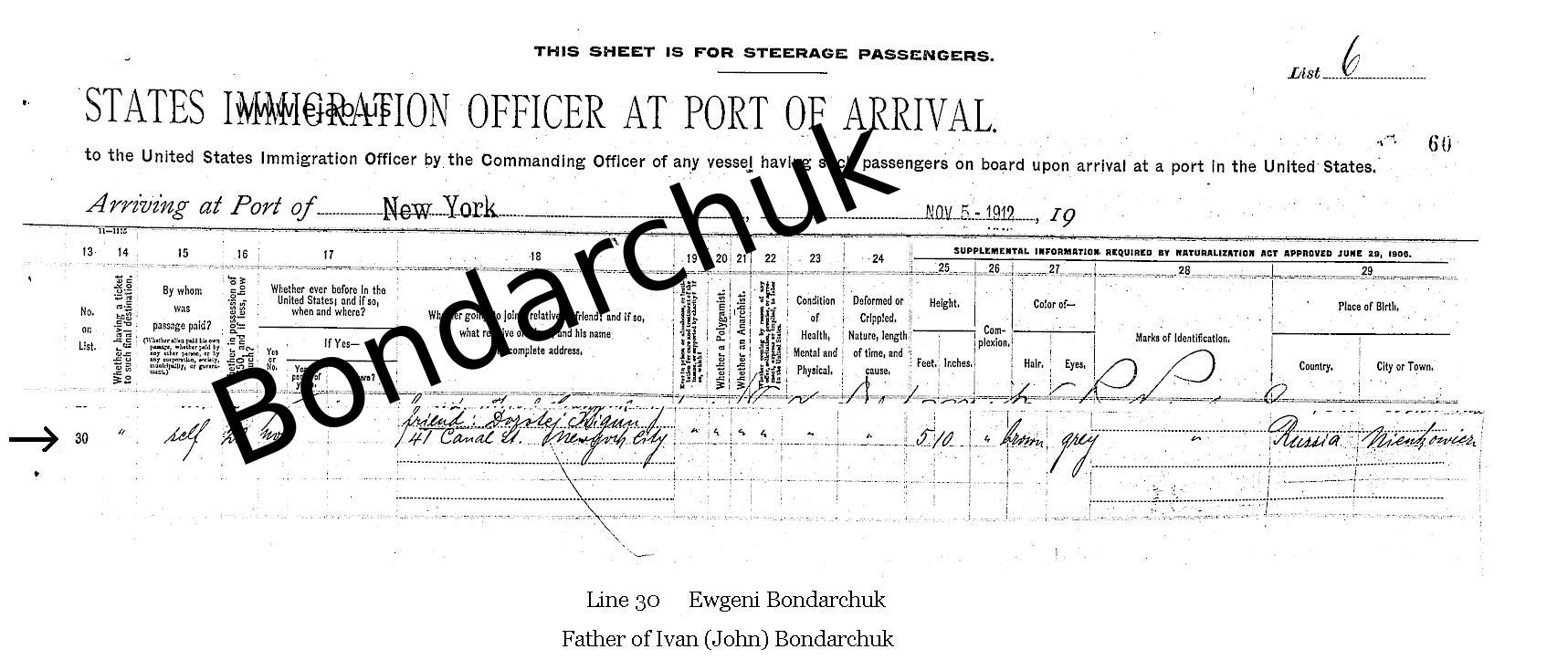 | Shared note | Bondarchuk last name origin & meaning: Bondar: occupational name for a cooper - one who makes barrels and tubs -chuk means "son of." John travelled with his father Evgeny on the SS Pennsylvania from Hamburg Germany leaving on October 12, 1912 and arriving in NY at Ellis Island on November 6, 1912. According to the ship's manifest, they were to meet with a friend named Dorobey Kidun on 41 Canal St. in NYC. John was listed as 18 years old, 5'7" with Blond hair and Brown eyes. His father was listed as 44 years old 5'10" with Brown hair and Gray eyes. They left behind Yelena in Niemkovichi who was Evgeny's wife and John's mother. According to the audio tape of Jenny (Adamiak) Bondarchuk, Evgeny stayed in the US for about 2 years. There is no confirmation that John had any siblings. Bondarchuk last name origin & meaning: Bondar: occupational name for a cooper - one who makes barrels and tubs -chuk means "son of." John travelled with his father Evgeny on the SS Pennsylvania from Hamburg Germany leaving on October 12, 1912 and arriving in NY at Ellis Island on November 6, 1912. According to the ship's manifest, they were to meet with a friend named Dorobey Kidun on 41 Canal St. in NYC. John was listed as 18 years old, 5'7" with Blond hair and Brown eyes. His father was listed as 44 years old 5'10" with Brown hair and Gray eyes. They left behind Yelena in Niemkovichi who was Evgeny's wife and John's mother. According to the audio tape of Jenny (Adamiak) Bondarchuk, Evgeny stayed in the US for about 2 years. There is no confirmation that John had any siblings. Bondarchuk last name origin & meaning: Bondar: occupational name for a cooper - one who makes barrels and tubs -chuk means "son of." John travelled with his father Evgeny on the SS Pennsylvania from Hamburg Germany leaving on October 12, 1912 and arriving in NY at Ellis Island on November 6, 1912. According to the ship's manifest, they were to meet with a friend named Dorobey Kidun on 41 Canal St. in NYC. John was listed as 18 years old, 5'7" with Blond hair and Brown eyes. His father was listed as 44 years old 5'10" with Brown hair and Gray eyes. They left behind Yelena in Niemkovichi who was Evgeny's wife and John's mother. According to the audio tape of Jenny (Adamiak) Bondarchuk, Evgeny stayed in the US for about 2 years. There is no confirmation that John had any siblings. |